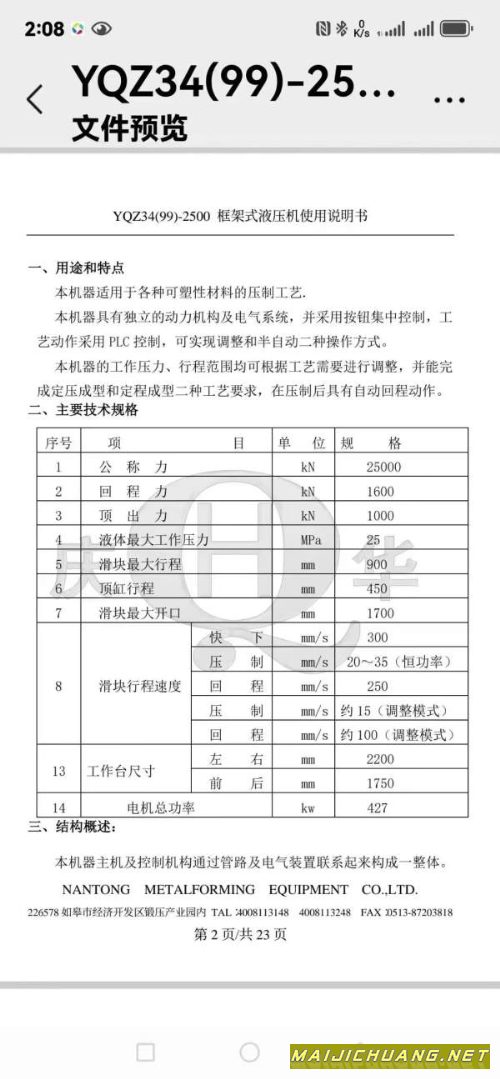南通锻压产2500吨7液压机,数据见图,私聊